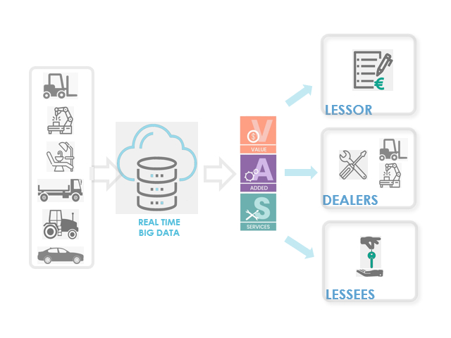 La piattaforma IoT di Kyaedge raccoglie ed elabora, per conto della società di locazione, tutti i dati provenienti dal sensore plug&play applicato al bene in locazione all’atto della consegna del bene all’utilizzatore da parte del dealer.
